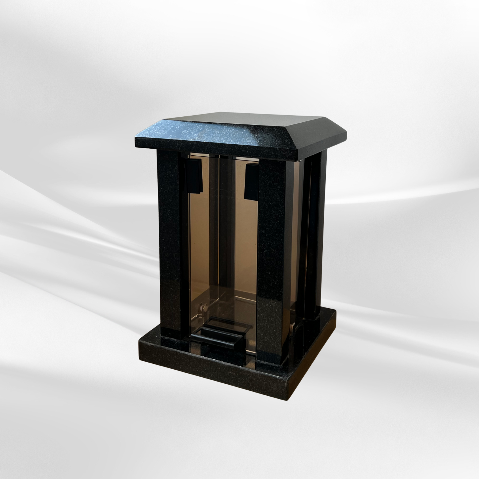 Klasikinio dizaino kapų žibintas, pagamintas iš juodo granito su stiklinėmis švelniai tamsintomis sienelėmis. Tvirtas, ilgaamžis, atsparus aplinkos poveikiui. Matmenys: 30x20x20 cm