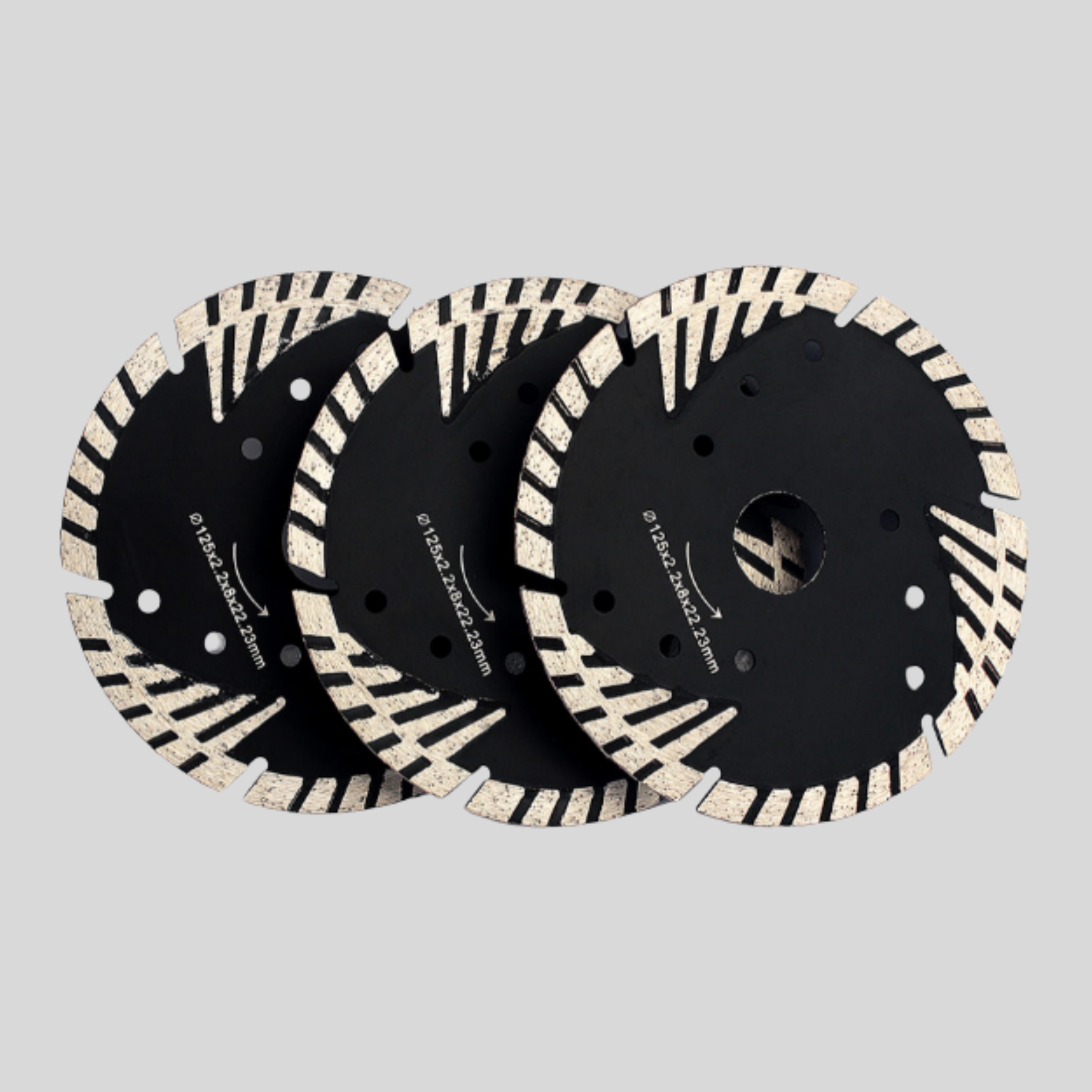 Aukštos kokybės turbo tipo pjovimo diskas su apsaugine trikampio formos briauna – skirtas efektyviam ir tiksliam granito pjovimui.
